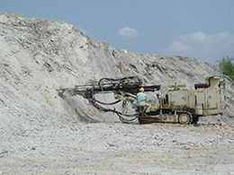 パーライトの原石は硬い岩盤であることが多く、ダイナマイトによる発破による採掘が基本ですが、一部地層が風化している場合などは重機による掘削が行われます。